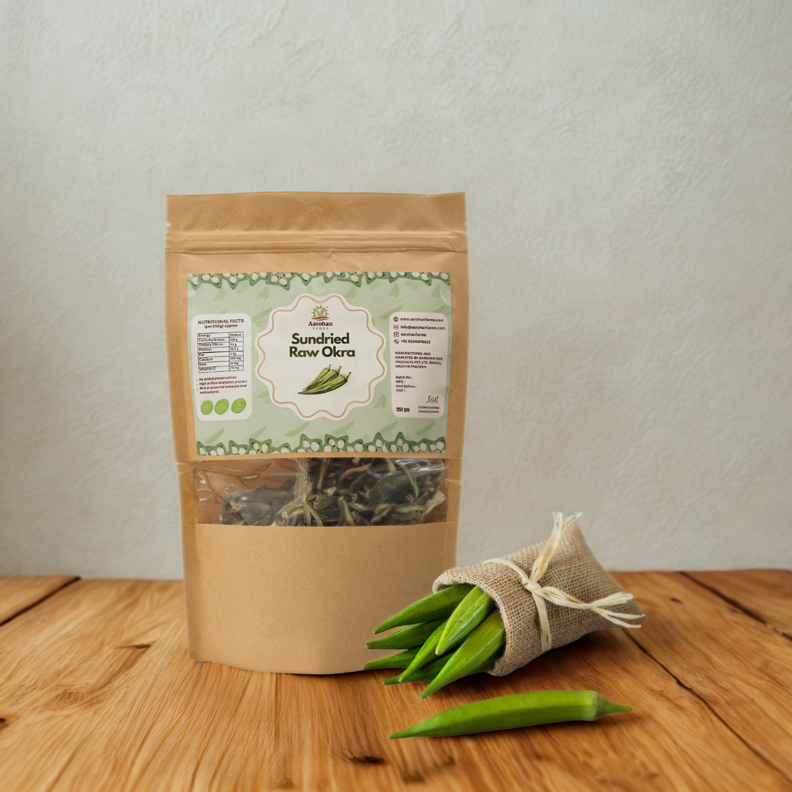 - Straight from our farm to your kitchen, Aarohan brings you hand-picked, premium-quality okra that's gently sun-dried to lock in its natural taste, nutrients, and vibrant green color.